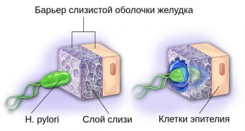• непосредственное прилипание Helicobacter pylori к клеткам эпителия (поверхностного слоя слизистой);