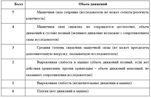 Пояснения: Шкала позволяет оценить силу исследуемых мышц на момент осмотра по баллам и определить характер распределения мышечной слабости.