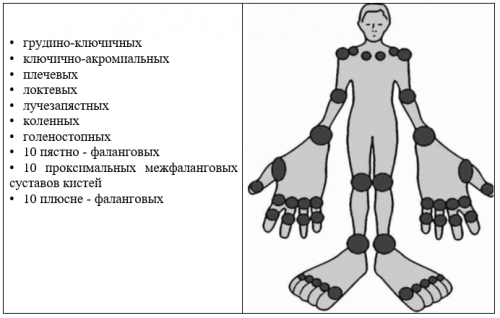 • 7-ые грудино-реберные сочленения (2 области)При АС оценивается наличие припухлости 44 суставов без учета степени выраженности изменений каждого отдельного сустава.Для подсчета индекса BASMI по 10-балльной шкале необходимо каждый показатель оценить по баллам от 0 до 10, затем вычисляется среднее арифметическое значение.