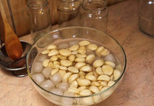 Принимать по 10 зубчики чеснока, сложить в чистую по одному зубчику Готовится следующим образом: