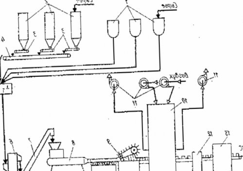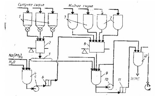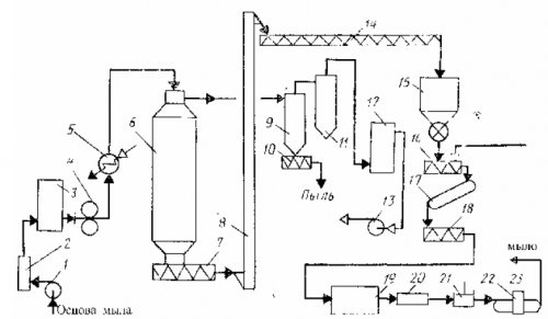 Прессование проводят в активной основы мыла последовательно подают на кислоты при температуре растворах они гидролизуются жидкого сырья; 4 – ленточный транспортёр; 5 – промежуточный бункер; 6 — молотковая дробилка; 7 – расходные бункеры; 8 – загрузочная воронка; 9 – пресс-машина;10 – воздуходувка; 11 – циклоны; 12 – шлюзовые затворыТехнологическая схема приготовления