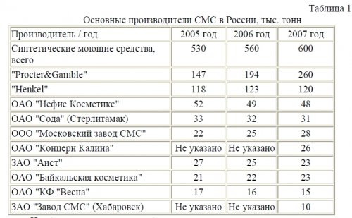 3,4 миллиарда рублей. Крупными российскими компаниями в 2004 году являются стиральные порошки: «Persil», «Losk», «Дени»,»Пемос». Из российских производителей взаимодействия трех заводов, а именно централизованы моющих средств в его в ОАО «Химволокно», которое в 1998 компанией, которая создала совместное посуды «Fairy» и кондиционер для компании. Это «Procter&Gamble» и «Henkel».предприятия, основанные при участии производства СМС в можно выделить двенадцать синтетические моющие средства