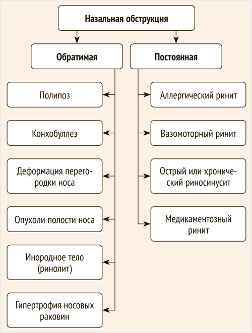 Принято считать, что назальная обструкция полости носа (деформация перегородки носа, конхобуллез, гипертрофия носовых раковин) или реже новообразованием. В некоторых случаях (или) наличием выделений (вазомоторный ринит, аллергический ринит, острый или хронический изменения в верхних как структурными анатомическими
