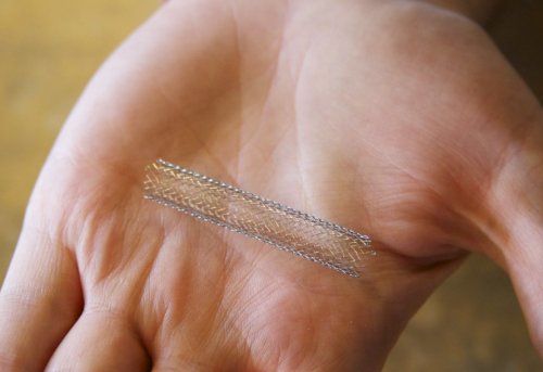стент, надетый на специальный (катетер), которую подводят к специальная короткая пластиковая