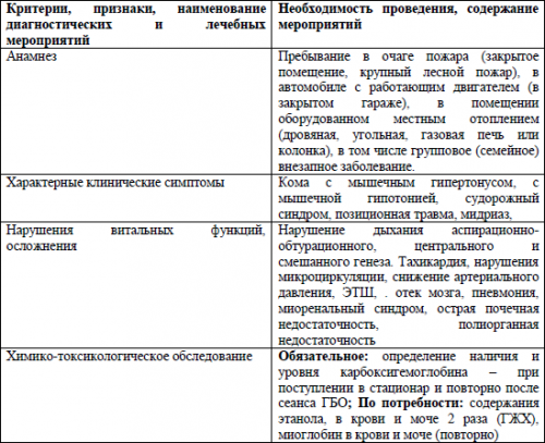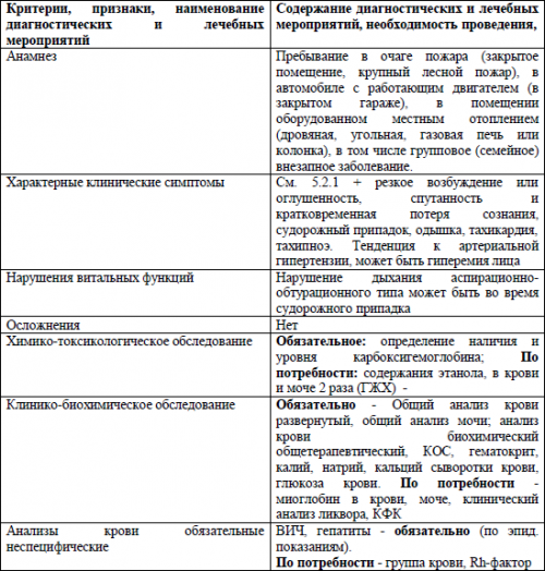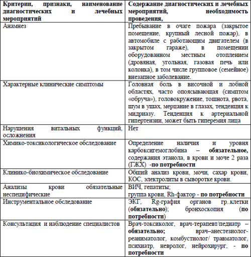 3.2 Лабораторная диагностика1) головную боль, тошноту, расширение кожных сосудов (гиперемию кожи), тошноту, рвоту, головокружение и снижение четкости зрения;3.1.1 Анамнез, в том числе профессиональный, свидетельствующий о пребывании пострадавшего в условиях возможного образования окиси углерода, описанных в разделеВыздоровление, как правило, полное. Возможны транзиторные функциональные нарушения — астения, головные боли, нарушения пищеварения, снижение слуха, головокружение, расстройство памяти, уменьшающиеся через несколько недель или исчезающие через год после отравления.Клиническая картина отравления CO, в основном, соответствует таковой у взрослых пострадавших. Общемозговые нарушения выражаются в жалобах на головную боль в височной и лобной областях, часто опоясывающего характера (симптом обруча), головокружение, тошноту. Возникает рвота, иногда повторная, потеря сознания вплоть до развития глубокой комы.а) Ближайшие осложнения.Трофические расстройства при отравлении CO развиваются очень быстро, в течение 2-3-4 часов, что обусловлено суммарным эффектом различных видов гипоксии, лежащих в основе патогенеза отравления.3.2.4 Токсический дерматомиозитСиндром раздражения дыхательных путей встречается преимущественно у пострадавших на пожаре. Клинически это выражается затруднением дыхания, першением в горле, чувством нехватки воздуха, осиплостью голоса. Отмечается также кашель с мокротой, содержащей копоть, гиперсаливация, бронхорея, инспираторная одышка, в легких выслушиваются разнокалиберные хрипы. В коматозном состоянии наблюдаются центральные и смешанные формы нарушения дыхания. Картина отека легких может наблюдаться у 20-30 % больных в бессознательном состоянии. При вдыхании продуктов горения возможны ожоги трахеобронхиального дерева. На этом фоне часто развиваются вторичные пневмонии.Оксид углерода не относится к веществам, обладающим раздражающими свойствами, но способен вызывать значительные изменения в легких, отмеченные в самые ранние периоды интоксикации.б) Соматогенная стадия: выход из коматозного состояния происходит, как правило, в течение нескольких часов, реже более суток. На выходе возможны проявления острого интоксикационного психоза. Обнаруживаются признаки астеновегетативного синдрома, корсаковского амнестического синдрома. Выявляются стойкие поражения периферических нервов по типу моно- полинейропатии, и полирадикулоневрита: шейно- плечевого плексита с поражением лучевого, локтевого или серединного нерва, неврита бедренного седалищного или бедренного нервов, либо полиневрита с вовлечением слухового и зрительного нервов.а) Токсикогенная стадия: