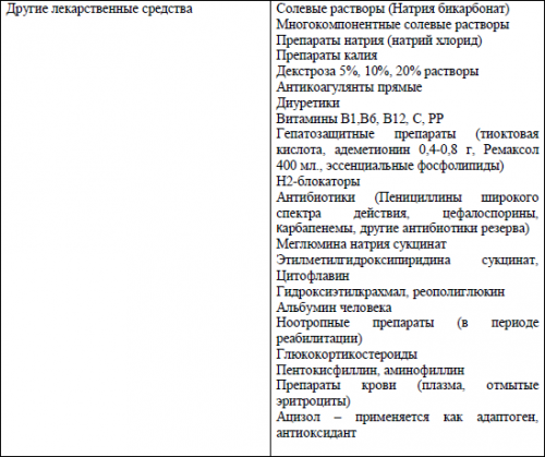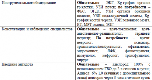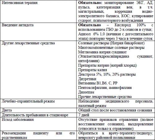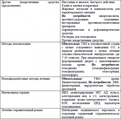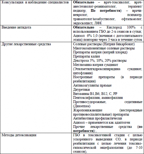 Отравление угарным газом— Стадия: токсикогенная, соматогеннаяСимптоматическая терапия проводится по тем же принципам, что для взрослых, но с учетом возрастных дозировок лекарственных средств.Лечебные мероприятия у детей и у взрослых не имеют принципиальных отличий. Они начинаются с удаления пострадавшего из зоны с повышенной концентрацией СО. В дальнейшем проводятся специфическая и симптоматическая терапия.Для коррекции гипоксических нарушений в ЦНС, сопровождающих отравление окисью углерода, показана нейропротективная терапия. Имеются данные об успешном применении меглюмина натрия сукцината (реамберина), инозина + никотинамида + рибофлавина + янтарной кислоты (цитофлавин) и др.Так как гиповолемия после перенесённого отравления СО является основной причиной острой недостаточности кровообращения, необходима её коррекция с помощью кристаллоидов, кровезаменителей в соотношении 3:1. При коррекции ОЦК ведётся борьба не только с гемической, но и с циркуляторной гипоксией, при этом величина гематокрита должна поддерживаться в пределах 35%. Важно строго контролировать баланс вводимой и выводимой жидкости, потери электролитов и воды восполнять электролитными растворами, применять растворы глюкозы (5% — 400-800 мл), с тиамина бромидм, пиридоксином.