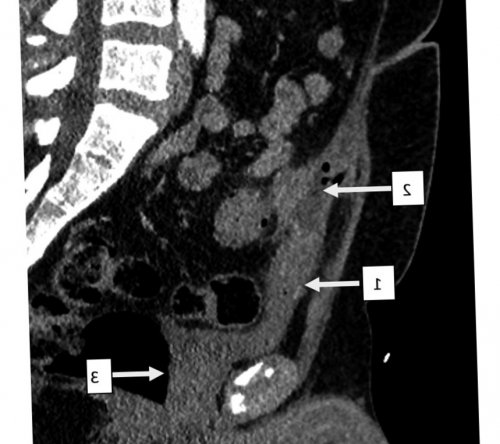 Сигмовидно-мочепузырный свищ, сагиттальная проекция, артериальная фаза. 1 — урахус; 2 — полость абсцесса; 3 — мочевой пузырь.