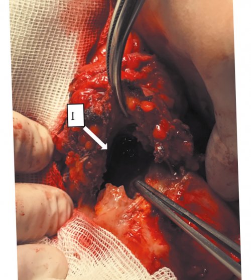 Рис. 4. Интраоперационная фотография дефекта в дне мочевого пузыря .