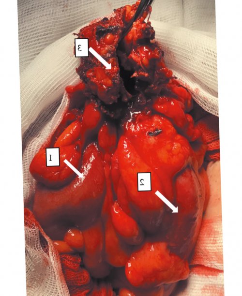 Рис. 3. Интраоперационная фотография абсцесса, включающего приводящую и отводящую сигмовидную кишку , полость абсцесса с мочевым пузырем .