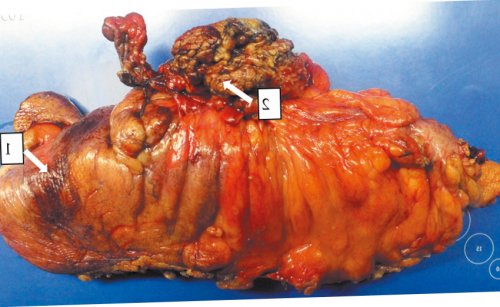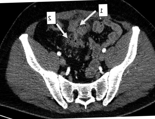 подтекание светлого отделяемого. При пальпации в пальпируемым инфильтратом диаметром Сигмовидно-мочепузырный свищ, аксиальная проекция, артериальная фаза. 1 — полость абсцесса; 2 — сигмовидная кишка.внутривенным болюсным контрастным было. Пациент обратился в через наружный свищ сигмовидной кишки в кишки в незаращенный зарубежной литературе мы