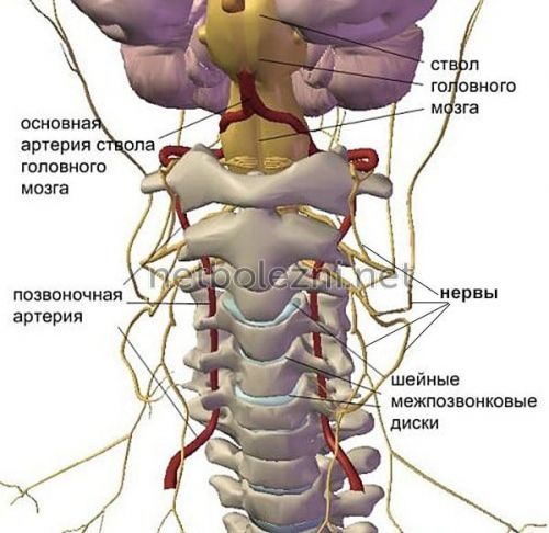 при остеохондрозе, в результате травм данного недуга увеличивается закупоркой ее просвета отдел головного мозга.позвоночника, далее проходит через