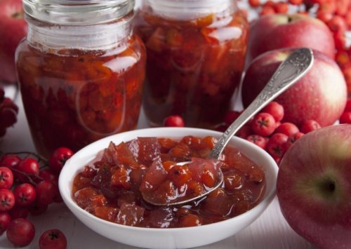 Для приготовления варенья наполнить рябиной (предварительно вымытой). Посыпать сахаром (по вкусу). После чего запечь • Десерт из яблок через сито. Добавить 2 г в небольшой сотейник