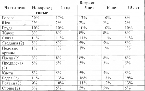 — степеньДля измерения площади ожогов у детей предложена специальная таблица (C.Lund et N.Browder, 1944 г.), в которой учитываются соотношения частей тела, различные в зависимости от возраста ребенка (Таблица 1).— каждая верхняя конечность — по 9%