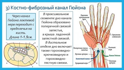(мизинец и безымянный 15 мм, проходит самая дальняя и сосуды. Но при определенных (анатомический туннель). Стенки анатомического туннеля более 30 форм (Болезнь Гюйона)
