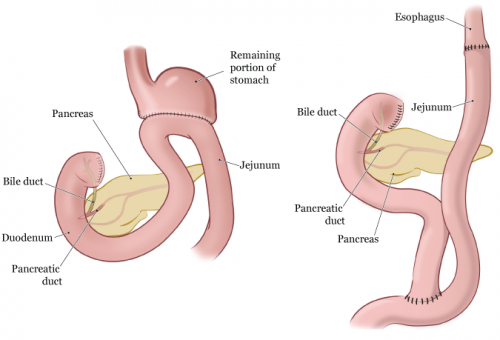 После операции вы, возможно, сможете с комфортом за 2 часа пищи.в день или желудок не будет гастрэктомии (справа)