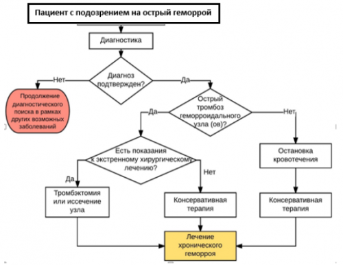 Примечание.* Под острым течением заболевания также понимается профузное, обильное кровотечение из внутренних геморроидальных узлов, требующее срочной госпитализации пациента в стационар для остановки кровотечения и проведения корригирующей терапии.