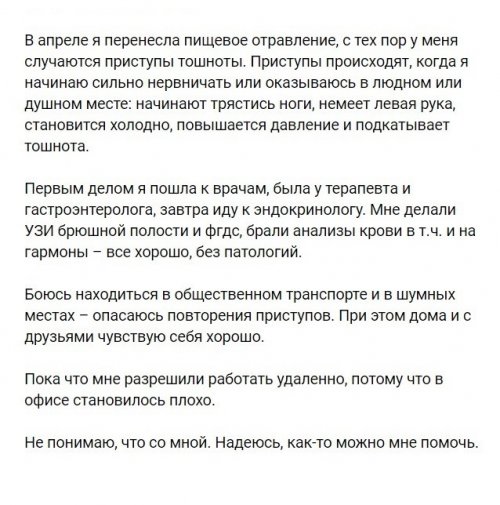 связывает с какими-то физическими проблемами, считает признаком болезни. | атака, — кажется, что с вами |