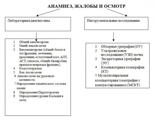 Длительность анамнез заболевания, наличие травм позвоночника, болевой синдром в виде колики, лейкоцитурия гематурияКритерии исключения диагнозаДиагностический алгоритм: (Схема)· Компьютерная томография (КТ)мочевыводящих путей:КТ позволяет определить размер конкремента, его локализацию и плотность.· бактериологический посев мочи:Исследование выделений на предметвыявлениябактерийпозволяетдиагностироватьинфекционныезаболеваниямочеиспускательныхканалов, а такжевыявитьвозбудителя и выявить к какому антибиотику есть чувствительность.Лабораторные исследования[4,6]:Из анамнеза:· тошноту;3. Резидуальные2. РецидивныеТаблица 3. Клиническая классификация мочекаменной болезниГенетические причиныМочевая кислотаКонкременты можно подразделить на те, которые образовались вследствие инфекции (инфекционные), и те, которые не были вызваны инфекцией (неинфекционные), а также конкременты, возникшие вследствие генетических нарушении, и конкременты образовавшиеся как побочное явление при приеме лекарств (лекарственные) (табл. 2).Урат аммония