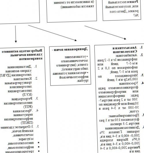 · Антибиотики:цефтриаксон 1г х 1- 2 раза в/м-5-7 дней или цефоперазон по 1,0 х 2 раза в/м 5-7 дней;· Диклофенак натрия 3,0-5,0 (75 – 125мг в сутки);· Режим постельный, полупостельный режим, профилактика переохлаждений, физических перегрузок;· улучшение общего самочувствия больного;· при необходимости проведение противовоспалительной терапии, с целью санации хронических очагов инфекции мочевой системы, при конкрементах которые вызывают обструкцию госпитализация в стационар.