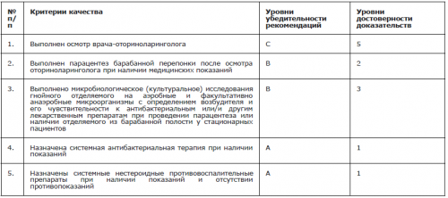 Приложение А2. Методология разработки клинических рекомендацийФГБУ «Национальный медицинский исследовательский центр оториноларингологии ФМБА России».4. Тулупов Д.А., к.м.н., доцент, член Национальной медицинской ассоциации оториноларингологов, член Педиатрического респираторного общества, конфликт интересов отсутствует.Таблица 2 – Критерии качества оказания медицинской помощиТермины и определенияОСО – острый средний отит;Список сокращенийНемедикаментозная профилактикаПосле стихания клинических проявлений ОСО пациенты должны наблюдаться оториноларингологом, особенно дети с рецидивирующим или затянувшимся течением ОСО. В постперфоративной стадии ОСО необходимо динамическое наблюдение пациента для оценки восстановления целостности барабанной перепонки и аэрации полостей среднего уха, применяя отомикроскопию, целесообразно проведение аудиологических исследований (тимпанометрии).