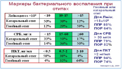 Уровень убедительности рекомендаций С (уровень достоверности доказательств – 5)Не показаны.• Рекомендовано проведение компьютерной томографии височных костей пациентам с ОСО в случаях затяжного течения заболевания (более 10 дней), а также, при выраженной стойкой отрицательной динамике и/или подозрении на мастоидит и внутричерепные осложнения с целью определения характера патологических изменений и выбора дальнейшей тактики лечения [5,42-44].• Рекомендовано проведение пневматической отоскопии пациентам с ОСО (при отсутствии реактивных проявлений со стороны барабанной перепонки) с целью определения податливости барабанной перепонки [34, 79].Таблица 2. Маркеры бактериального воспаления при отитахУровень убедительности рекомендаций C (уровень достоверности доказательств – 5)Постперфоративная стадия. Отоскопически определяется перфорация барабанной перепонки, из которой поступает гнойное отделяемое в наружный слуховой проход.