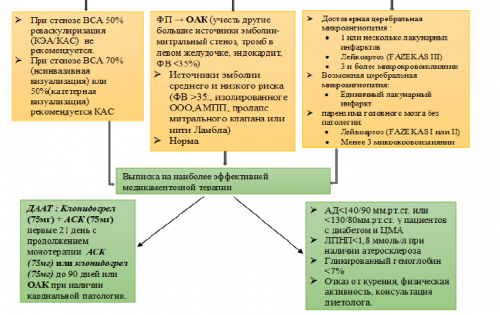 • Пациентам с ишемическим инсультом без установленной ишемической болезни сердца, больших источников кардиоэмболии и значениями ЛПНП (ХС-ЛПНП)> 2,5ммоль/л показана аторвастатин 80мг/сут для снижения риска повторного инсульта. (класс I, УД — А) .• У пациентов с ишемическим инсультом или ТИА при наличии диабета лечение должно включать гипогликемические препараты с доказанной кардиоваскулярной пользой для снижения риска больших неблагоприятных сердечно-сосудистых событий (например, инсульт, инфаркт миокарда, сердечно-сосудистая смерть). (класс І, УД-B) .• У пациентов с артериальной гипертензией, перенесших инсульт или ТИА, рекомендуются индивидуальные схемы приема лекарств, учитывающие сопутствующие заболевания, фармакологический класс агента и предпочтения пациента, чтобы максимизировать эффективность лекарственного средства. (класс I, УД-В) .Медикаментозное лечение: доставка пациента в течение 40 минут в инсультный центр.Факторы риска — различные клинические, биохимические, поведенческие и другие характеристики, свойственные отдельному человеку (отдельным популяциям), а также внешние воздействия, наличие которых указывает на повышенную вероятность развития определенного заболевания.Тактика лечения: при подозрении на ТИА рекомендуется незамедлительный вызов скорой неотложной медицинской помощи. консультация эндокринолога с целью коррекции гипергликемии и для разработки программы вторичной индивидуальной профилактики у больных сахарным диабетом;