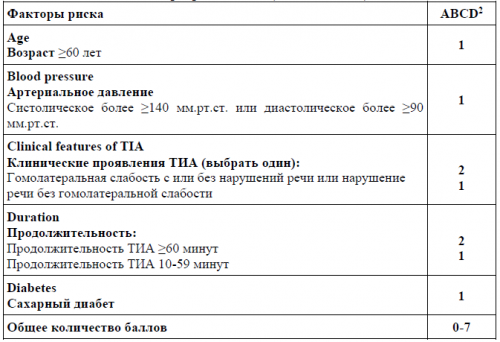 низкого риска: 0-3; высокого риска: 6-7.«Факторы риска ТИА» (Шкала ABCD²)