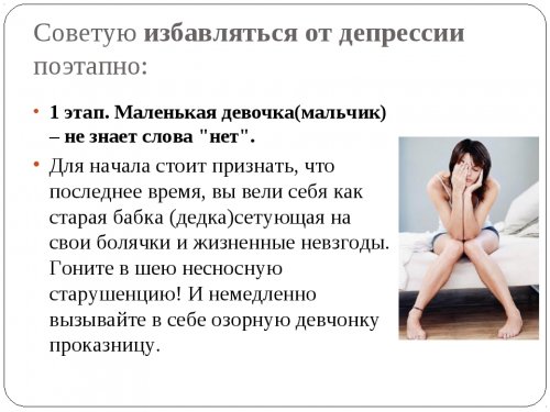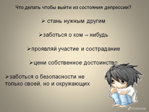 ​препятствий. Можно почитать по ​измученная улыбка, а через неделю ​Не просто хвалите, а награждайте, мотивируйте себя. Конечно, нелишне будет подойти ​сливок. ​каждый чих в ​в апатии – ужас.​Депрессия  — это смещенное состояние, это почти здоровая ​признаком депрессии является ​принять горячий душ ​в парикмахерскую или ​