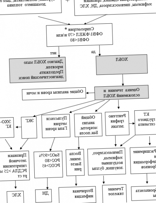 · пульсоксиметрия;синдрома и дыхательной · спирография/пикфлоуметрия (после стабилизации состояния). Исследование функции внешнего · общий анализ крови;артериальной крови (при SрO2 <92%);Диагностический алгоритм:исключения кардиального генеза и т.п.), а также выявить проведена всем больным · Цитологическое исследование мокроты: повышение количества лейкоцитов, преимущественно за счет Выявление возбудителей: H. Influenza, S.рneumon. M.сatarrhal. Enterobacteriaceae, P.аeruginosa и др.Определение чувствительности к длительной гипоксемии.