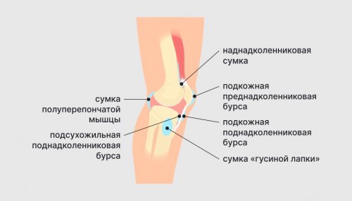 колена. Заболевание сопровождается болью сумка в области стороне колена.• сумка «гусиной лапки» (анзериновая): расположена в области коленной чашечкой (надколенником);и смягчить давление