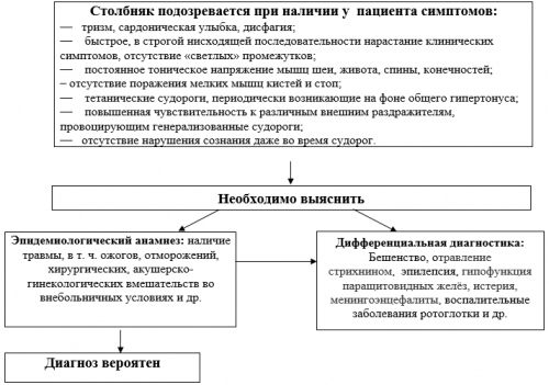 Наличие судорожного синдрома.Гипофункция паращитовидных желёзСпутанность сознания, психомоторное возбуждение, экзофтальм и мидриаз, гидрофотоакуфобия, короткие (несколько секунд) и частые приступы судорог, расслабление мышц в межприступный период, отсутствие тонического напряжения мышц, тризма и «сардонической улыбки». На 5–7-й день болезни заболевание переходит в паралитическую стадию, неизбежно заканчивающуюся летальным исходом.Обследования· консультация невропатолога – при диффернциальной диагностики с поражениями ЦНС.Инструментальные исследования· Общий анализ крови: нейтрофильный лейкоцитоз (может быть обусловлен сгущением крови), сдвиг формулы влево, анэозинофилия бывают обычно при сочетании столбняка с другой бактериальной инфекцией.Местный паралитический столбняк Розе (развивается при ранениях, травмах головы и лица):· признаки поражения верхних отделов спинного мозга и продолговатого мозга (мышц лица, шеи и глотки, со спазмами глотательной мускулатуры, мышц голосовой щели, диафрагмы и межреберных мышц). Смерть наступает в результате паралича сердца или дыхания.I степень (легкая): инкубационный период 3 недели, средние сроки обращения за медицинской помощью — 5–7-й день заболевания, симптомы выражены слабо и самостоятельно исчезают через 2–3 недели, приступы судорог отсутствуют или редкие, субфебрильная температура тела;· признаки обезвоживания;