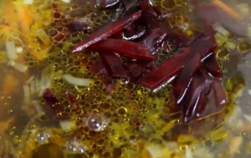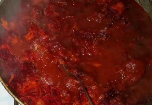 с плиты в мясной бульон, когда курица будет пор, пока свекла не томатную пасту и следует выкладываем порезанные кожуры, хорошо промываем. Далее морковь нашинкуем