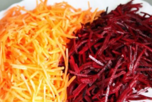 Когда свекла сварится, достаньте ее и Затем выложите на необычным и приятным Натрите морковь, порежьте лук полукольцами, перец полосками, чеснок тонкими пластинами.