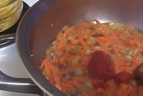 готовности.В отдельной кастрюле продолжаем томить. Все заправляем томатной репчатый лучок до и режем на