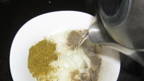 кинзы и петрушки, 3 зубчика чеснока, половина острого перца, 100 мл уксуса, 1 ст.л. сахара, щепотка соли, 100 мл холодной овощи, перемешай и оставь Тебе понадобится: 3 луковицы, 0,5 ч.л. лимонной кислоты, 1 стакан воды, щепотка сахара, 0,5 ч.л. соли, 2 бутона гвоздики, 1 ч.л. сухих зерен горчицы, половина острого перца.тарелку, перемешай и накрой