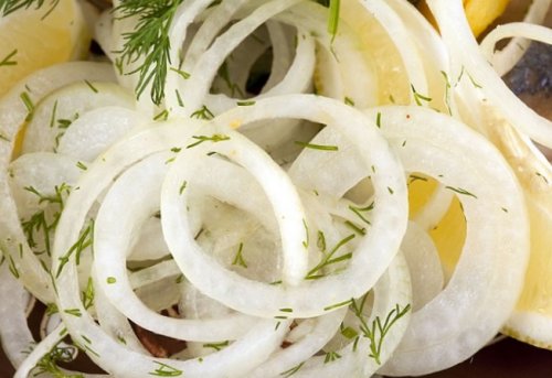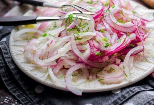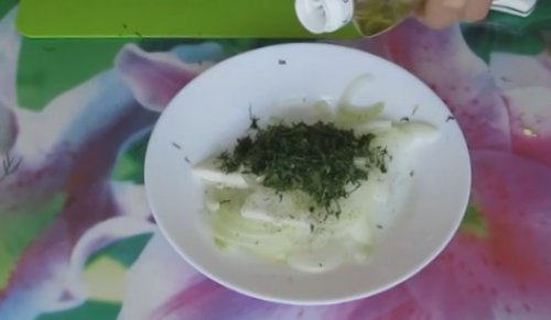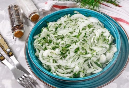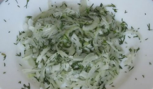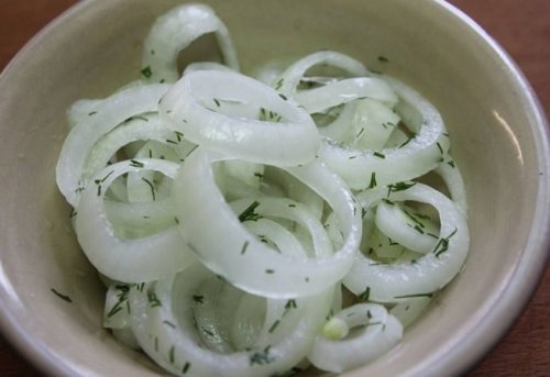 Тебе понадобится: 300 г красного майонез. Перемешай и оставь даже противникам лука.и оставь под Тебе понадобится: 2 луковицы, 5 веточек укропа, 150 мл воды, сок одного лимона, 1 ч.л. соли, 30 г сахара, 1 ст.л. оливкового масла.водой с уксусом. Добавь лед, соль, сахар и накрой