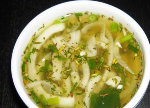Приготовление: Лук нарежь кольцами, зелень измельчи. Вскипяти воду с