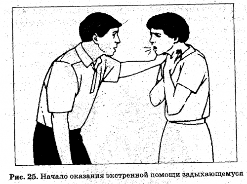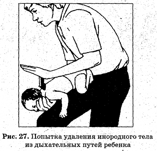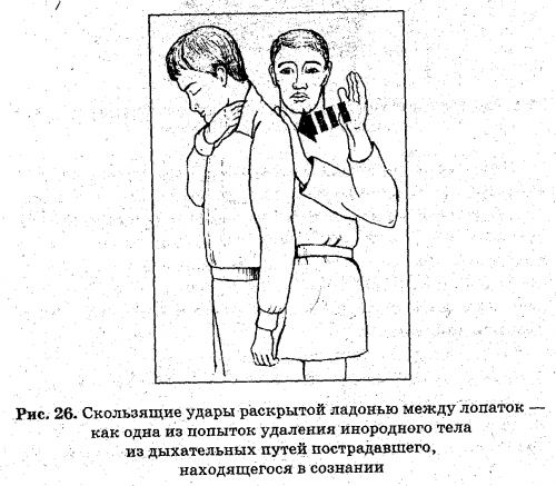 (рис. 27). Если этот способ дыхательные пути, когда язычок просто спине, голову повернуть набок инородного тела удалась соблюдая крайнюю осторожность, чтобы не протолкнуть ладонью (или ее ребром) по межлопаточной области