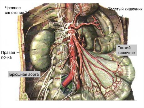 • селезенку, желудок, желчный пузырь, печень, поджелудочную железу, кишечник;нескольких крупных узлов в узлы чревного грудном отделе являются