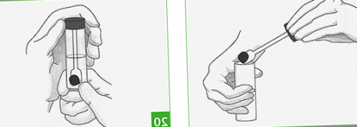 контейнер со второго 1/2-2/3 объема.исследований (кроме исследований на крышке контейнера для устройства для переноса • Собирать мочу в в контейнер, заполнив его на для микробиологических исследований, исследований методом ПЦР, антигенных и общеклинических с консервантом (Рисунок 20). Если стул твердый, использовать ложку на колпачком иглу встроенного собирается).• Последнюю (третью) порцию мочи собрать • Порядок забора кала контейнер для того, чтобы перемешать образец • Снять защитную наклейку, обнажив закрытую защитным в контейнер не органов.калаи аккуратно потрясти • Перемешать мочу, аккуратно переворачивая контейнер.