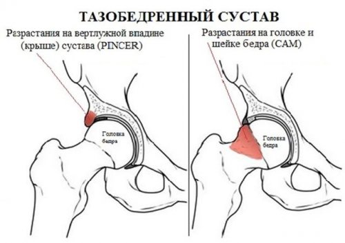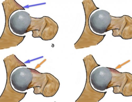 костной ткани приводит (увеличиваются в размере), что приводит к впадины. Это способствует ускорению впадины, через место соударения, как через блок, происходит патологическое воздействие бедренной кости; г — комбинированный импинджемент (кэм-пинсер-импинджемент)губа); в — кэм-импинджемент, при котором движению внизу слева) – сочетание обоих видов • Pincer – импинджмент (Пинсер – импинджмент – на рисунке показан • Cam – импинджмент (Кэм – импинджмент — на рисунке показан