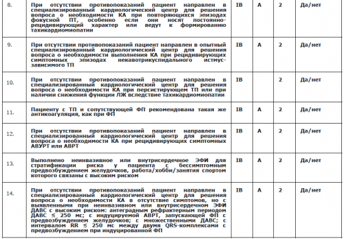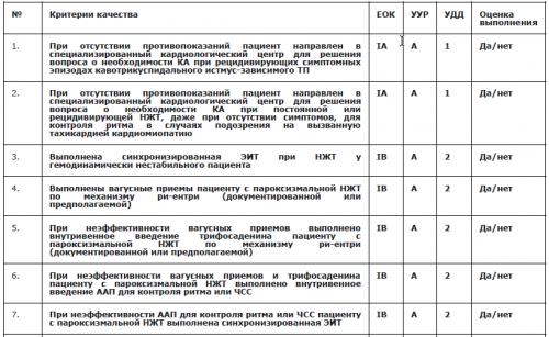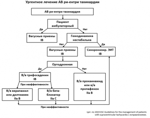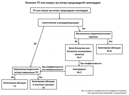 ЕОК I A (УДД 5 УУР С)Комментарии: Диагноз устанавливается путем исключения ишемической болезни сердца, пороков клапанов сердца, артериальной гипертензии, злоупотребления алкоголем и т. д., демонстрации восстановления функции ЛЖ после устранения аритмии или значительного уменьшения ЧСС. Обычно при вызванной тахикардией кардиомиопатии ФВ ЛЖ составляет менее 30%, конечный диастолический диаметр ЛЖ – менее 65 мм, а конечный систолический диаметр ЛЖ – менее 50 мм . При большей дилатации желудочков предполагают наличие дилатационной кардиомиопатии.Комментарии: Неизвестно, уменьшает ли лечение пациентов с высоким бременем предсердной экстрасистолии с помощью ААП или КА риск развития НЖТ, инсульта и смертельного исхода.Комментарии: Лечение основной сердечно-сосудистой патологии (артериальная гипертензия, ишемическая болезнь сердца), выявление и коррекция эндокринных (гипертиреоз, сахарный диабет) и электролитных расстройств (гипокалиемия, гипомагниемия), ограничение применения симпатомиметиков, теофиллина являются компонентами профилактики рецидивов НЖТ [13, 22].6) в случаях несоблюдения пациентом предписаний или правил внутреннего распорядка лечебно-профилактического учреждения, если это не угрожает жизни больного и здоровью окружающих.1) при выздоровлении пациента;6) неэффективность амбулаторного лечения у пациентов с частыми рецидивами НЖТ.1) невозможность проведения лечебных мероприятий в амбулаторно-поликлинических условиях;Комментарии: В случаях возникновения любых осложнений после КА, в том числе отсроченных, показана скорейшая госпитализация в специализированный кардиологический/кардиохирургический стационар для проведения необходимых лечебно-диагностических мероприятий [272, 273].ЕОК IIa C (УУР C, УДД 4)ЕОК IIa C (УДД 4 УУР C)ЕОК IIa C (УДД 4 УУР C)• Незамедлительная ЭИТ рекомендуется при любой НЖТ, сопровождающейся нестабильной гемодинамикой [262, 263].Комментарии: Неотложная терапия не отличается от общих принципов лечения НЖТ с узкими QRS-комплексами. Рандомизированные исследования для этой группы пациентов отсутствуют. Проаритмическое действие ААП особенно актуально для больных с врожденными пороками сердца, часто имеющих дисфункцию СУ или предрасположенность к нарушениям АВ проведения. Следовательно, ААП в этой группе должны применяться с осторожностью, как резерв у симптомных пациентов после КА и оптимизации гемодинамики (например, коррекции ведущих клапанных проблем). Бета-адреноблокаторы могут использоваться для замедления АВ проводимости и могут быть применены с осторожностью у больных с транспозицией магистральных сосудов после операции переключения. Есть данные о снижении частоты фибрилляции желудочков и/или обоснованных срабатываний имплантированного кардиовертера-дефибриллятора• Пациентам с НЖТ, которым планируется хирургическая коррекция врожденного порока сердца, рекомендуется КА перед вмешательством или хирургическая изоляция аритмогенных зон во время операции [252-254].ЕОК I B (УДД 4 УУР С)• Внутривенное введение 10–30 мг #трифосаденина болюсом рекомендуется при неэффективности вагусных приемов [82–84].ЕОК I C (УДД 4 УУР C)ЕОК IIb B (УДД 2 УУР B)2.7. Лечение атриовентрикулярных ри-ентри тахикардий (при наличии манифестирующих или скрытых аномальных проводящих путей)• Рекомендуется КА, но при этом риск арт
