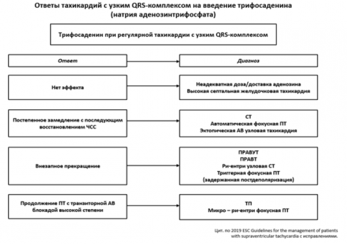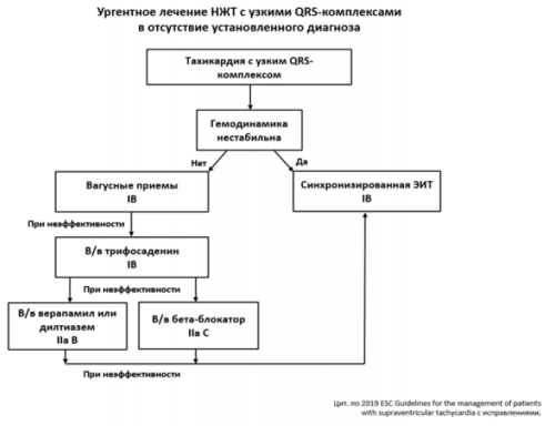• При стабильной гемодинамике рекомендуется внутривенное введение 10–30 мг #трифосаденина болюсом [82–84].ЕОК I B (УДД 4 УУР С)• При неэффективности вагусных приемов и отсутствии признаков предвозбуждения желудочков на ЭКГ покоя рекомендуется внутривенное введение #трифосаденина [112, 113].Алгоритм ургентного лечения НЖТ с широкими QRS-комплексами в отсутствии установленного диагноза представлен в Приложении Б-4.— продолжительность настоящего пароксизма.— состояние гемодинамики;ЕОК IIa C (УДД 4 УУР С)• Для купирования НЖТ неясного генеза с узкими комплексами QRS у гемодинамически стабильных пациентов рекомендуются вагусные приемы [101, 102].ЕОК IC (УДД 4 УУР C)Комментарии: Лекарственный тест с внутривенным введением #трифосаденина, так же как и проведение вагусных маневров, может иметь важное значение при дифференциальной диагностике НЖТ. Купирование тахикардии с зубцом Р´, расположенным после комплекса QRS, предполагает наличие АВРТ или АВУРТ. ПТ чаще всего нечувствительна к #трифосаденину. Трансформация в тахикардию с AВ блокадой фактически указывает на ПТ или ТП, в зависимости от интервала P-P или F-F), исключает АВРТ и делает АВУРТ маловероятной. Алгоритм дифференциальной диагностики НЖТ, основой которого являются результаты внутривенного введения #трифосаденина на фоне тахиаритмии, представлен в Приложении Б-2.• Пациентам с НЖТ для оценки размеров и функции предсердий и желудочков, а также насосной функции сердца рекомендуется проведение трансторакальной эхокардиографии [73–81].и имплантируемых кардиовертеров-дефибрилляторов. В ряде случаев необходимо неинвазивное или внутрисердечное ЭФИ. Помимо электрокардиографических, при обследовании пациентов с имеющейся или предполагаемой НЖТ могут потребоваться другие методы обследования. Наиболее важным из них является трансторакальная эхокардиография, помогающая в выявлении структурных изменений сердца, в том числе – тахикардиомиопатии. В числе прочих методов – проба с физической нагрузкой, вагусные приемы, пассивная ортостатическая проба (тилт-тест) и т. д.Антидромная АВРТ встречается примерно у 5% пациентов с синдромом WPW, наблюдается при функционирующих трактах Махайма, наличие которых может быть установлено только при внутрисердечном ЭФИ или по типичной ЭКГ. Волна возбуждения распространяется антеградно через ДАВС, а ретроградно – через AВ узел или другое ДАВС, обычно расположенное с противоположной стороны, что обеспечивает достаточное время для выхода из состояния рефрактерности элементов петли ри-ентри. Антидромная АВРТ обычно имеет ЧСС 150–200 в 1 минуту, а также следующие особенности ЭКГ :1. интервал RP’ короче P’R;2) АВРТ антидромная;2) расширение комплекса QRS более 120 мс;Для не-ри-ентри (автоматической) узловой тахикардии характерны короткий интервал RP’ (при проведении возбуждения 1:1) или АВ диссоциация. Изредка тахикардия может быть нерегулярной и напоминать ФП. Отличительная черта фокусной узловой тахикардии – ее происхождение из АВ узла или пучка Гиса. Это местонахождение начала аритмии приводит к возникновению разных ЭКГ-признаков, поскольку для существования аритмии не требуется участия ни предсердий, ни желудочков. ЧСС обычно от 110 до 250 в 1 минуту, комплексы QRS узкие или с морфологией типичной блокады ножек пучка Гиса. Изолированные скрытые узловые экстрасистол