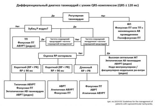 Не-ри-ентри (автоматическая) узловая тахикардияПри полифокусной ПТ ЧСС не слишком высокая, в связи с чем эта НЖТ часто носит асимптомный характер, а аритмогенная кардиомиопатия развивается редко.Синдром постуральной ортостатической тахикардии диагностируется во время 10-минутного активного стендового теста или теста с запрокидыванием головы при неинвазивном гемодинамическом мониторинге. При обследовании пациента с подозрением на синдром постуральной ортостатической тахикардии следует исключить другие причины СТ, такие как гиповолемия, анемия, гипертиреоз, тромбоэмболия легочной артерии или феохромоцитома. Клинический анамнез должен быть сосредоточен на определении хронического состояния, возможных причин ортостатической тахикардии, модифицирующих факторов, влияния на повседневную деятельность и потенциальных триггеров.4. механизм аритмии демонстрируется независимо от проводимости AВ узла;Синусовая узловая ри-ентри тахикардия возникает в результате циркуляции волны возбуждения с участием СУ и, в отличие от нефизиологической СТ, характеризуется приступообразным характером (сердцебиение, головокружение, иногда обморок). На ЭКГ форма зубцов P’ сходна с синусовыми. Диагноз может быть подтвержден с помощью внутрисердечного ЭФИ, которое показано пациентам с частыми или плохо переносимыми эпизодами тахикардии с неуточненным механизмом, не отвечающими на медикаментозную терапию.Синусовая тахикардия• антидромная АВРТ, обусловленная атриофасцикулярным путем, обычно создает горизонтальную или вертикальную ось QRS, но также может возникать нормальная ось, в зависимости от способа внедрения в правую ножку пучка Гиса;Пассивно проводящий дополнительный путь. При наличии фокусной ПТ, ТП, ФП или АВУРТ комплексы могут проводиться на желудочек через ДАВС, когда дополнительный путь проводит импульсы пассивно и не является критической частью схемы повторного входа.Фокусная тахикардия из АВ соединения является редкой аритмией, обычно связана с аномальным автоматизмом из области АВ узла или проксимальной части пучка Гиса. Тахикардия может носить врожденный характер и часто наблюдается в раннем периоде после открытых операций на сердце у младенцев. Нередко врожденная фокусная тахикардия из АВ соединения является причиной развития аритмогенной кардиомиопатии, сопровождается весьма высокой смертностью.Возможен редкий (» 6% всех случаев) вариант обратного распространения возбуждения: антеградно – по «быстрому» пути, ретроградно – по «медленному» (так называемая «fast-slow»-тахикардия), а также еще более редкий: «slow-slow».Левопредсердная макро-ри-ентри ПТ: цепи, поддерживающие эту тахиаритмию, чаще всего обусловлены электрически молчащими (рубец) участками измененной ткани после медицинских вмешательств или прогрессирующей предсердной дегенерации/фиброза. Часто возникают анатомические препятствия, такие как устья легочных вен и фиброзное кольцо митрального клапана.Полифокусная ПТ определяется как учащенный, нерегулярный ритм с тремя морфологически различными P-волнами на электрокардиограмме (ЭКГ) и, как правило, связана со значимой структурной патологией предсердий (атриопатией). Полифокусная ПТ чаще всего регистрируется у пациентов с «хроническим легочным сердцем» на фоне длительно персистирующих бронхолег