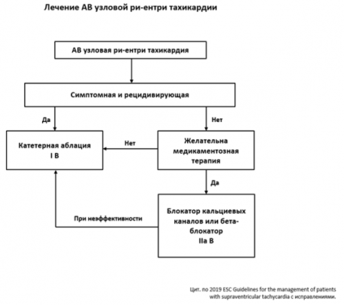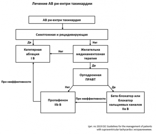 Пациенты с малосимптомными короткими и нечастыми эпизодами тахикардии могут наблюдаться без КА или длительной ААТ. Примерно половина из них становится асимптомными в течение последующих 13 лет. ААТ снижает частоту и длительность АВУРТ с эффективностью от 13 до 82%, менее чем у 20% терапия может быть в последующем отменена. С учетом высоких результатов и минимального риска КА у симптомных пациентов, ААТ имеет ограниченное значение. Алгоритм лечения АВУРТ представлен в Приложении Б-12.ЕОК нет (УДД 4 УУР C)