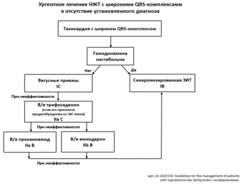 • Пациентам с нестабильной гемодинамикой рекомендуется синхронизированная ЭИТ [97–99].ЕОК IIb B (УДД 2 УУР A)• У гемодинамически стабильных пациентов в начале лечения рекомендуется проведение вагусных приемов [101, 102, 106].1.2. Неотложная терапия при тахикардиях неясного генеза с широкими (120 мс) QRS-комплексами