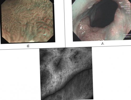 • кардиальный желудочный эпителий (кардиальный или «переходный» тип, представленный только слизистыми железами, а также его кислотообразующий кардиальный подтип, в котором выявляются единичные главные и обкладочные клетки) — неотличимый от эпителия кардиального отдела желудкаПри наличии в пищеводе активного воспаления с развитием эрозий и язв необходимо проводить биопсию после курса антисекреторной терапии, что позволит избежать ложноположительных результатов в отношении наличия дисплазии эпителия.Четкое определение уровня истинного КЭП крайне необходимо для адекватной оценки длины сегмента метаплазированного эпителия и соответственно выявления пациентов группы риска развития АКП. В качестве критерия КЭП необходимо использовать дистальный край палисадных сосудов слизистой оболочки пищевода или уровень проксимального края складок кардиального отдела желудка [70,26,27,28]. Однако, в ряде случаев, определение уровня КЭП затруднено, что обусловлено наличием более чем у половины пациентов с подозрением на ПБ таких осложнений ГЭРБ, как дистальный рефлюкс-эзофагит и эрозивно-язвенное поражение пищевода, что осложняет визуализацию сосудистой архитектоники слизистой оболочки. У ряда пациентов с протяженными аксиальными или фиксированными аксиально-параэзофагеальными грыжами ПОД определить уровень проксимального края складок кардии представляется затруднительным вследствие их сглаживания. Таким образом, при оценке истинного уровня КЭП необходимо использовать оба вышеописанных критерия.Точность данного исследования в сочетании с эндоскопией высокого разрешения в определении типа метаплазированного эпителия в пищеводе, оценки наличия различных этапов неопластической прогрессии ПБ приближается к 100%. При выявлении КМ слизистой оболочки пищевода на эндомикроскопическом изображении четко визуализируются темные бокаловидные клетки и эпителиоциты кишечного типа с вытянутыми ядрами. Дисплазия высокой степени в пределах сегмента ПБ при КЛЭ характеризуется увеличением, полиморфизмом ядер эпителиоцитов, нарушением полярности их расположения и, в отдельных случаях – формированием конгломератов из крупных полиморфных ядерВ настоящее время для уточняющей эндоскопической диагностики ПБ применяются высокочувствительные эндоскопические технологии: эндоскопия с высоким разрешением (до 1 млн пикселей) в комбинации с узкоспектральной эндоскопией NBI, в том числе и с оптическим увеличением до 150 раз, а также – методы эндоскопии сверхвысокого увеличения, в частности — конфокальная лазерная эндомикроскопия (КЛЭ)[41, 42, 124].Диагноз ПБ не может быть установлен при рентгенологическом исследовании. Этот метод используется лишь для выявления грыжи пищеводного отверстия диафрагмы у больных с ПБ.Развитие и прогрессирование дисплазии в каждом индивидуальном случае нельзя точно предопределить. У части больных заболевание может длительное время не прогрессировать и лишь у небольшого процента (6% — 25%) пациентов с ПБ с дисплазией эпителия низкой степени развивается дисплазия высокой степени и рак. Значительный процент регрессии дисплазии низкой степени частично можно объяснить неоднозначной трактовкой данного понятия, особенно при наличии воспалительных изменений.Связь между длиной сегмента ПБ без дисплазии и рис