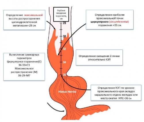 Железы расположены “спина к спине”Дисплазия низкой степениA. Кишечная метаплазия без дисплазии – кардиального типа железы с бокаловидными клетками с вакуолями со слизью, окрашенными в голубовато-синий цвет. Цитоархитектоника не нарушена. Умеренная воспалительная инфильтрация собственной пластинки слизистой оболочки;Отсутствие дисплазии – регулярная цито- и гистоархитектоника, ядра не варьируют значительно в размерах или по форме, локализованы базально, число ядрышек в них не увеличено. Эпителий зрелый, с нормальным ядерно-цитоплазматическим соотношением. Допустимы фокальная ядерная стратификация и небольшое число дистрофически измененных бокаловидных клеток. Митозы обнаруживают только в базальных (крипты), отделах желез. При воспалении возможно появление определенного клеточного полиморфизма клеток и их ядер, рост числа митозов (реактивные регенераторные изменения).Именно в аспекте возможности развития в пищеводе различных вариантов метаплазированного эпителия крайне важно четкое указание врачом-эндоскопистом уровня выполнения биопсии относительно КЭП, с целью исключения случаев забора материала ниже уровня КЭП (из кардии) и, в результате – ошибочного диагноза ПБ .Обязательным признаком КМ является наличие крупных бокаловидных клеток, цитоплазма которых содержит вакуоли, заполненные слизью, которая при окраске гематоксилином и эозином окрашивается в голубовато-синий цвет. При морфологическом исследовании вероятность выявления КМ т.е. обнаружение специфических бокаловидных клеток, увеличивается при использовании PAS-реакции или окраске альциановым синим при pH раствора 2,5. Следует, однако, особенно при таких дополнительных окрасках, дифференцировать истинные бокаловидные клетки и псевдобокаловидные слизистые клетки.Рис.2 Оценка циркулярного (С) поражения и максимальной протяженности (М) цилиндроклеточной метаплазии согласно Пражским критериямОднако, на сегодняшний день показано, что выделение в отдельное понятие «ультракороткого сегмента ПБ» не оправдано, так как в большинстве (93,1%) этих случаев метаплазия в пищеводе представлена желудочными ее типами с низким потенциалом малигнизации [70,88,89,90,91].Перед выполнением комплексного эндоскопического исследования с забором биопсийного материала гастроэнтеролог должен назначить курс антисекреторной терапии ИПП для уменьшения степени воспалительной инфильтрации слизистой оболочке ПБ, затрудняющей диагностику диспластических изменений эпителияОднако, принимая во внимание трудоемкость множественной биопсии, необходимость обработки и оценки большого объема морфологического материала, и более чем 80%-вероятность пропуска фокусов дисплазии и ранней аденокарциномы на фоне ПБ, подобный протокол сложно рекомендовать в качестве стандартного. .