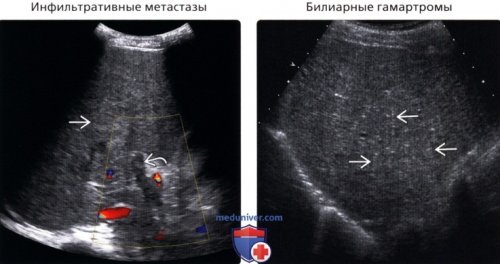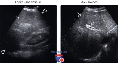 Дифференциальная диагностика:срез у пациента, страдающего саркоидозом. Отмечается гепатомегалия (длина 26 см) и неоднородность печеночной гиперэхогенными очагами, некоторые из которых (Правый) На косом трансабдоминальном