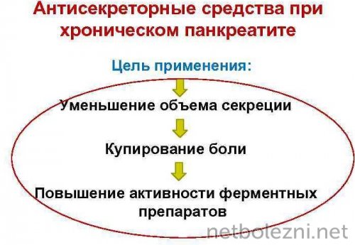 В результате нарушается моторная функция 12-перстной кишки, развивается дуоденальная гипертензия, формируется дуоденально-панкреатический рефлюкс. За счет таких изменений требуется контроль продукции кислоты в желудке, что позволяет сгладить клинические проявления.Из группы антисекреторных средств
